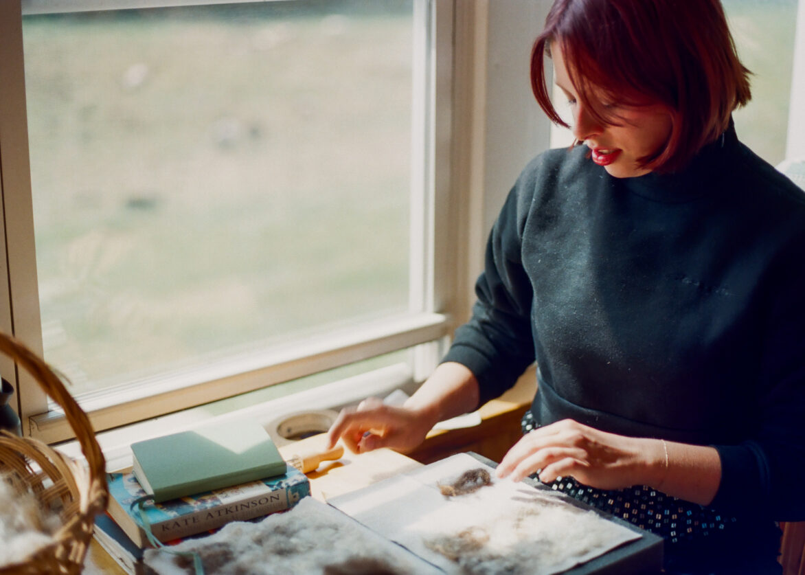 2025 Fiber Arts Resident, Rose Chiarello works with wool from Gael Roots Community Farm during her residency. Courtesy of Catskill Art Space. Photo by Lauren Daccache.