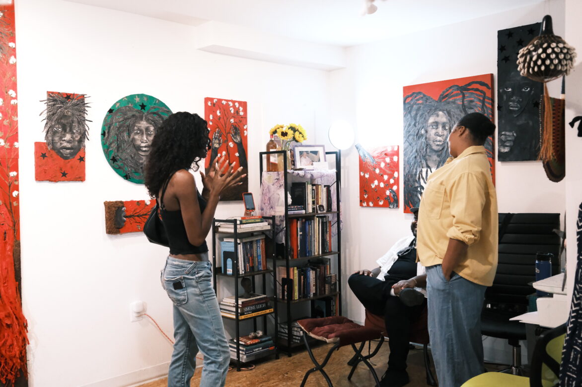 Visitors in Paula Mans’ studio at Hamiltonian Artists. Open Studios, September 13, 2025. Photo by Sandy Cheng.